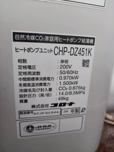 花巻市星が丘 コロナ自然冷媒CO2家庭用ヒートポンプ給湯機ヒートポンプユニットCHP-DZ451K、貯湯ユニットCTU-37AZ1K エコキュート交換工事
